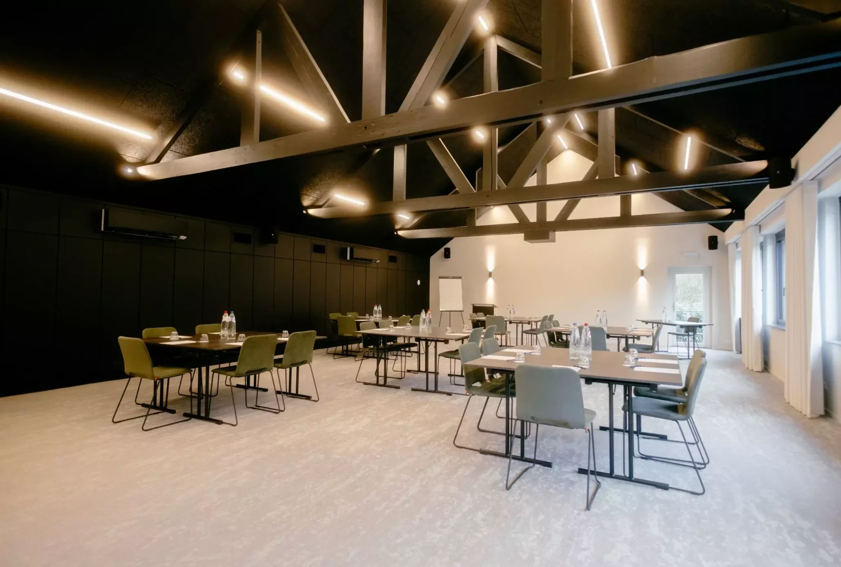 Salle modulable pour séminaires, réunions, conférences ou événements privés. Un cadre au vert, de l’espace pour accueillir un groupe confortablement, et la proximité directe des hébergements, de la brasserie et des infrastructures du domaine.