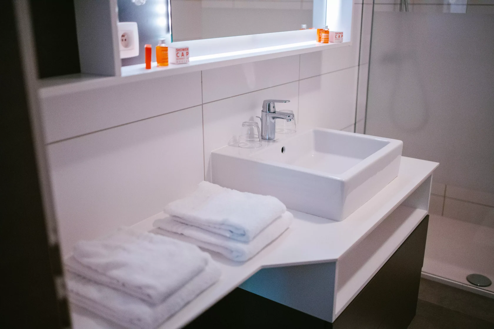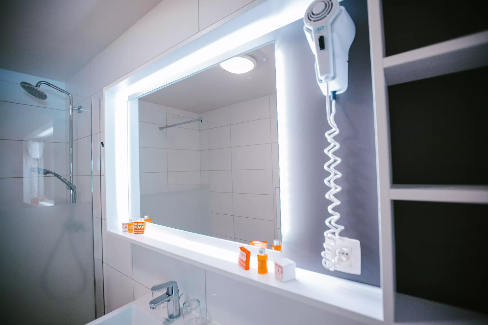 Équipée d’une douche, d’un lavabo, d’un sèche-cheveux et d’articles de toilette essentiels.